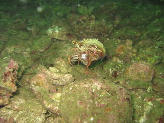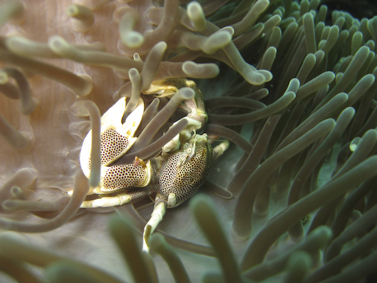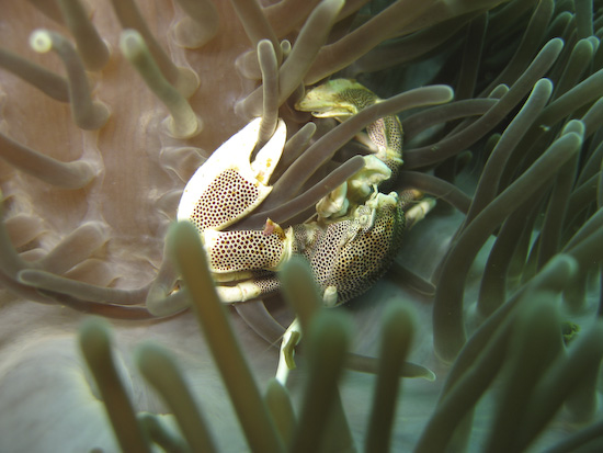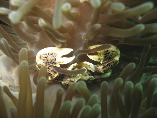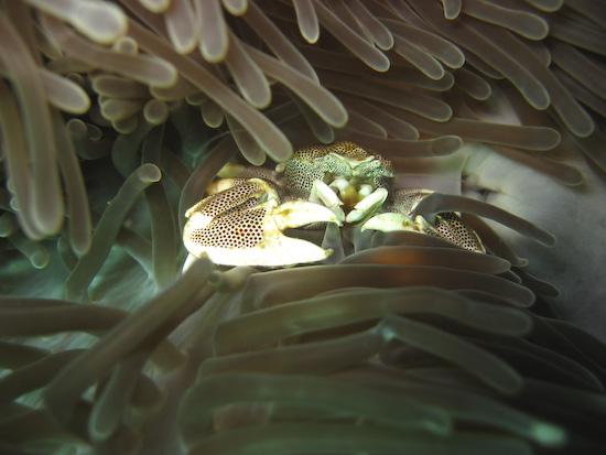 Our luck with the better visibility continued the next day at High Rock, where we did our last two dives of the trip. A photographer’s favourite thanks to the tree that continues to cling tenaciously to the top, High Rock is a simple, circular dive site which flattens out onto a sandy bottom around 20 metres. It was here we found some fantastic luck finding macro critters – Clive found not one but two pineapple fish, elusive little critters that are very shy. Ayesha spotted a yellow seahorse thanks to it standing out on against a green coral background, while two huge nudis were also spotted on the slopes as we first descended. On the safety stop, I found this photogenic porcelain crab lurking amongst an anemone – a great finale to our Burma dive trip.