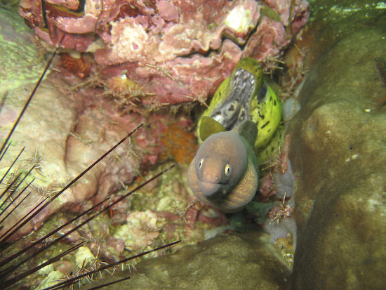 Once through the ravine and back onto the reef, things calmed down a bit and we had a chance to look for yellow morays out hunting and getting cleaned by giant cleaner shrimp – most divers were, I think, still getting their breath back from the barracuda encounter.