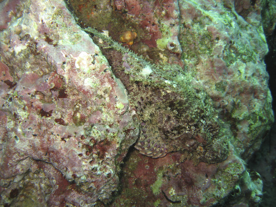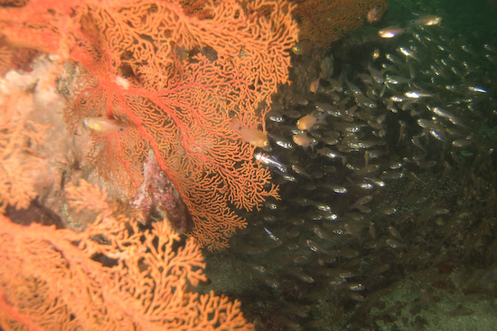 Beyond the narrow part of the ravine lies the very short tunnel, which emerges after a few metres onto the reef. This is a simple slope that is clouded with lots of glassfish and the other usual tropical suspects, plus a lot of scorpionfish – you have to be careful any time you are taking a photo – and hordes of morays. A carpet of anemones billowed across the rocks, cuttlefish weaved in and out of the sea fans along with juvenile sweetlips doing their high-energy jitter. There’s so much going on that one dive is simply not enough to see it all, so doing the following dive in reverse (Out Through The In Door) also worked well.